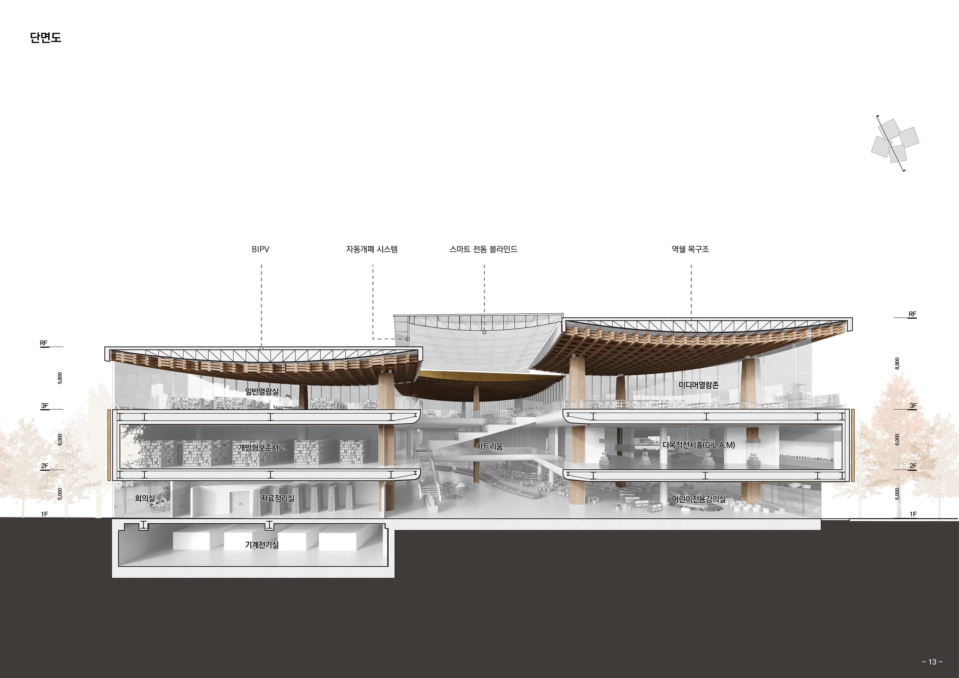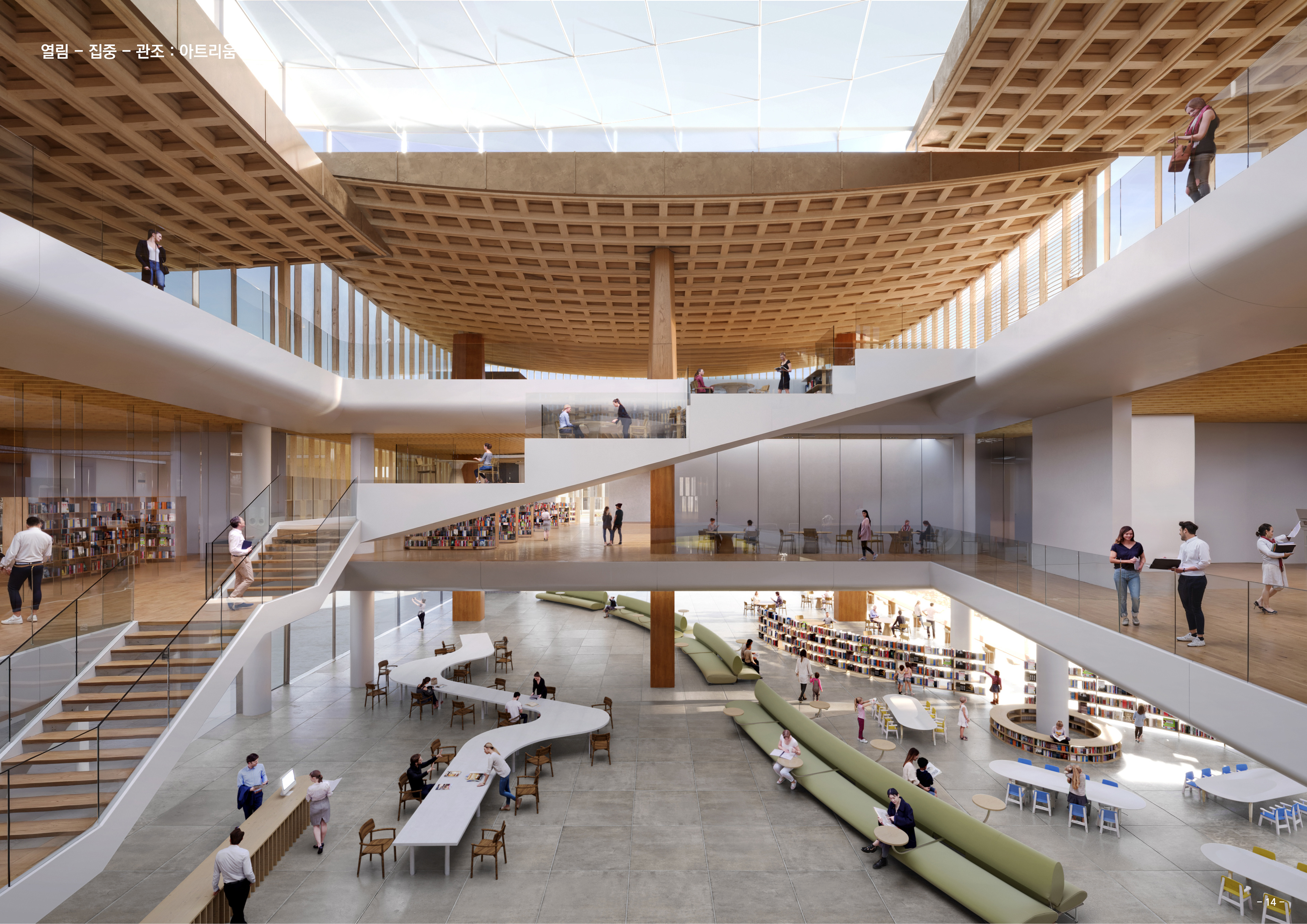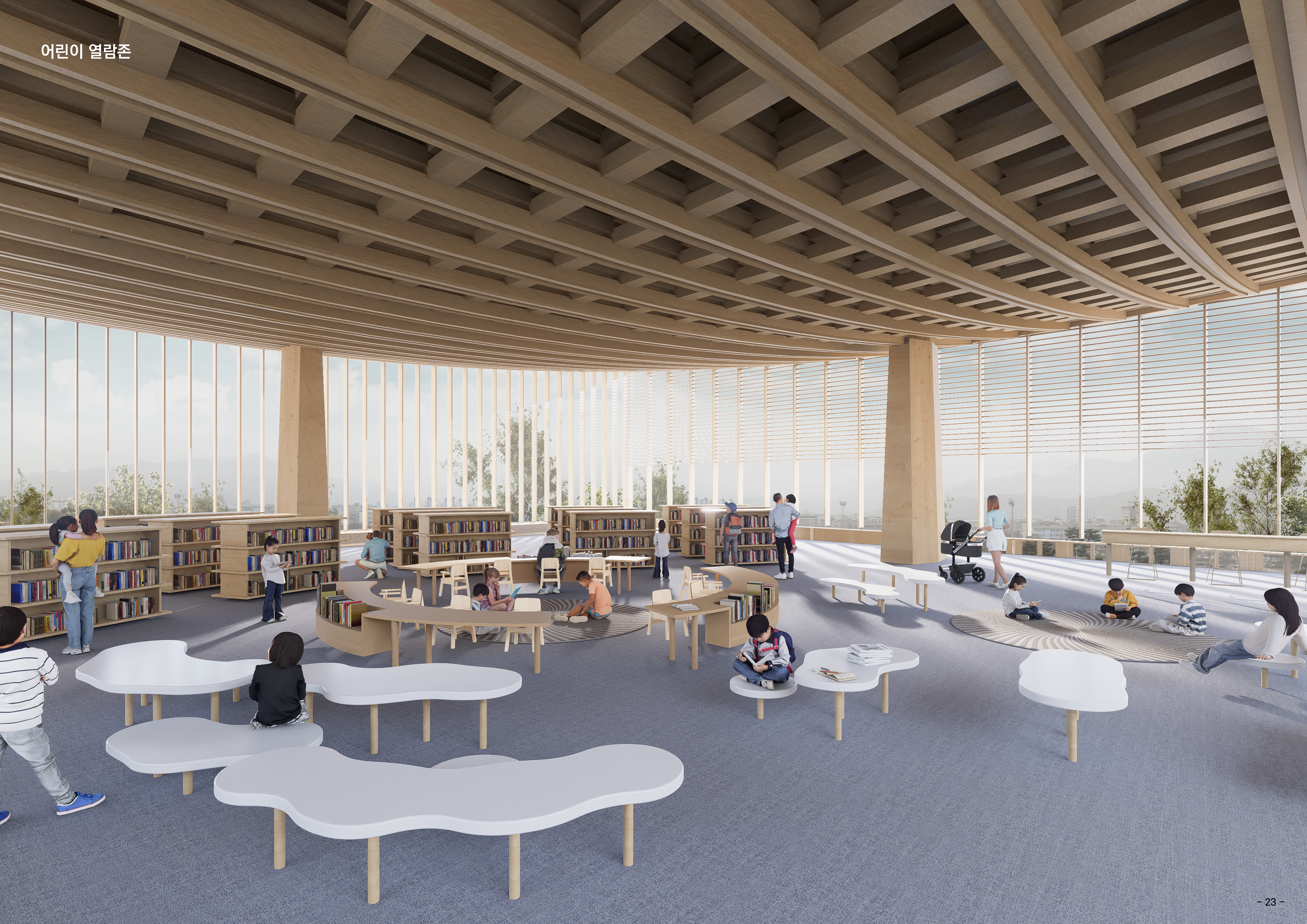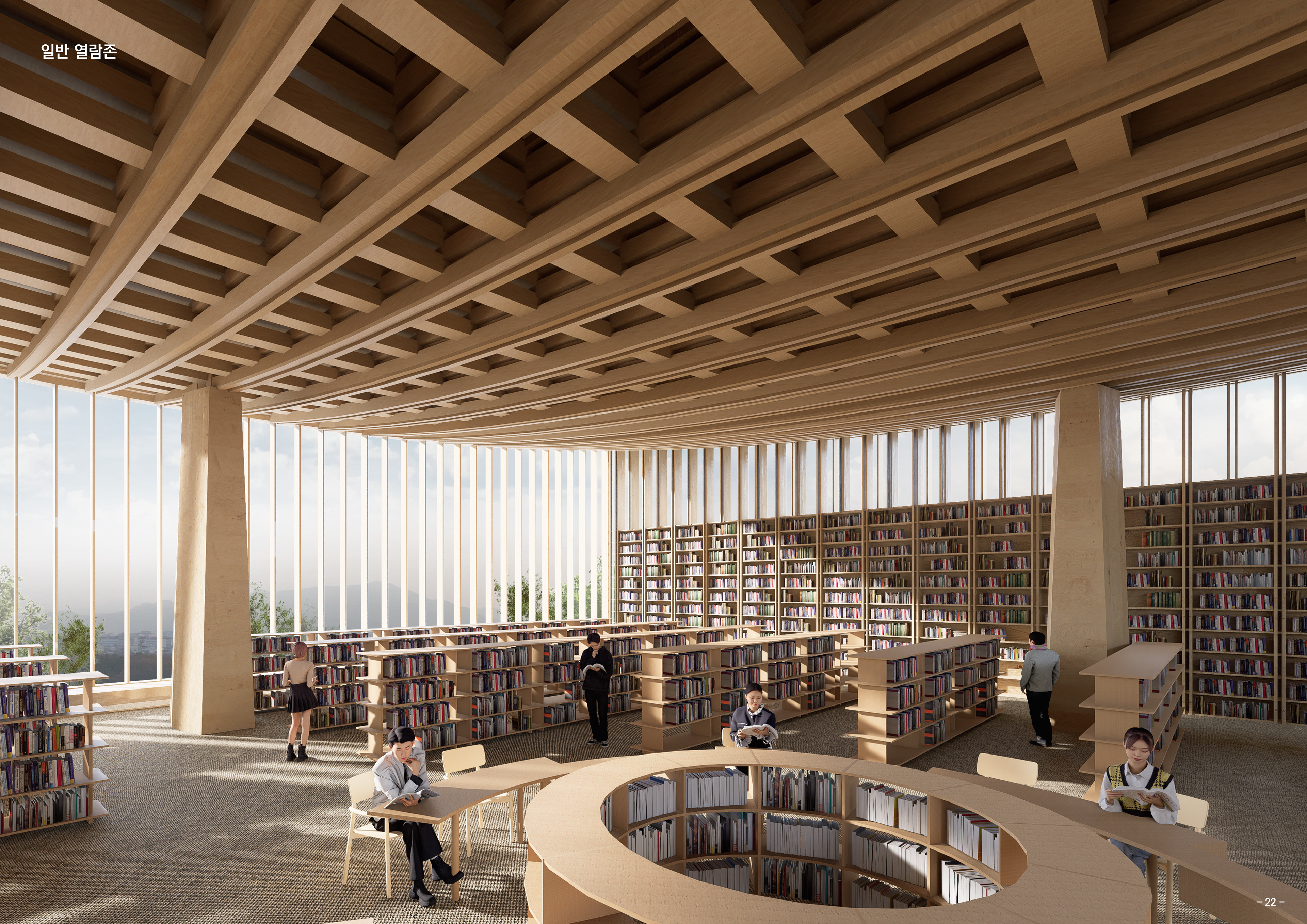방문객의 많은 비율은 도서관 내의 오래 머물수 있는공간이 될것이다. 건축적 제안은 단순한 프로그램 나열이 아닌, 수직적으로 연계되는 하나의 시퀀스로 계획된다. 1층은 가장 활기있고 개방된 층으로, 사람들이 만나는 사회적 레벨. 2층은 빛과 환경을 조율하며 전시와 자료 관리가 안정적으로 이루어 지는 문화레벨, 3층은 숲에 둘러쌓인 독서와 사유에 깊이 몰입하는 관조의 레벨로 구성된다.