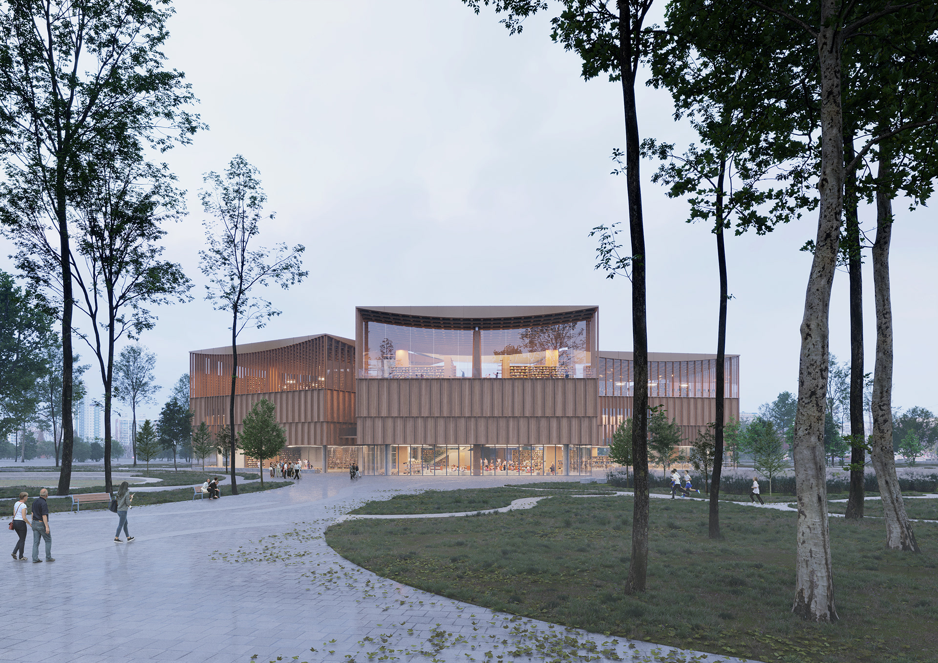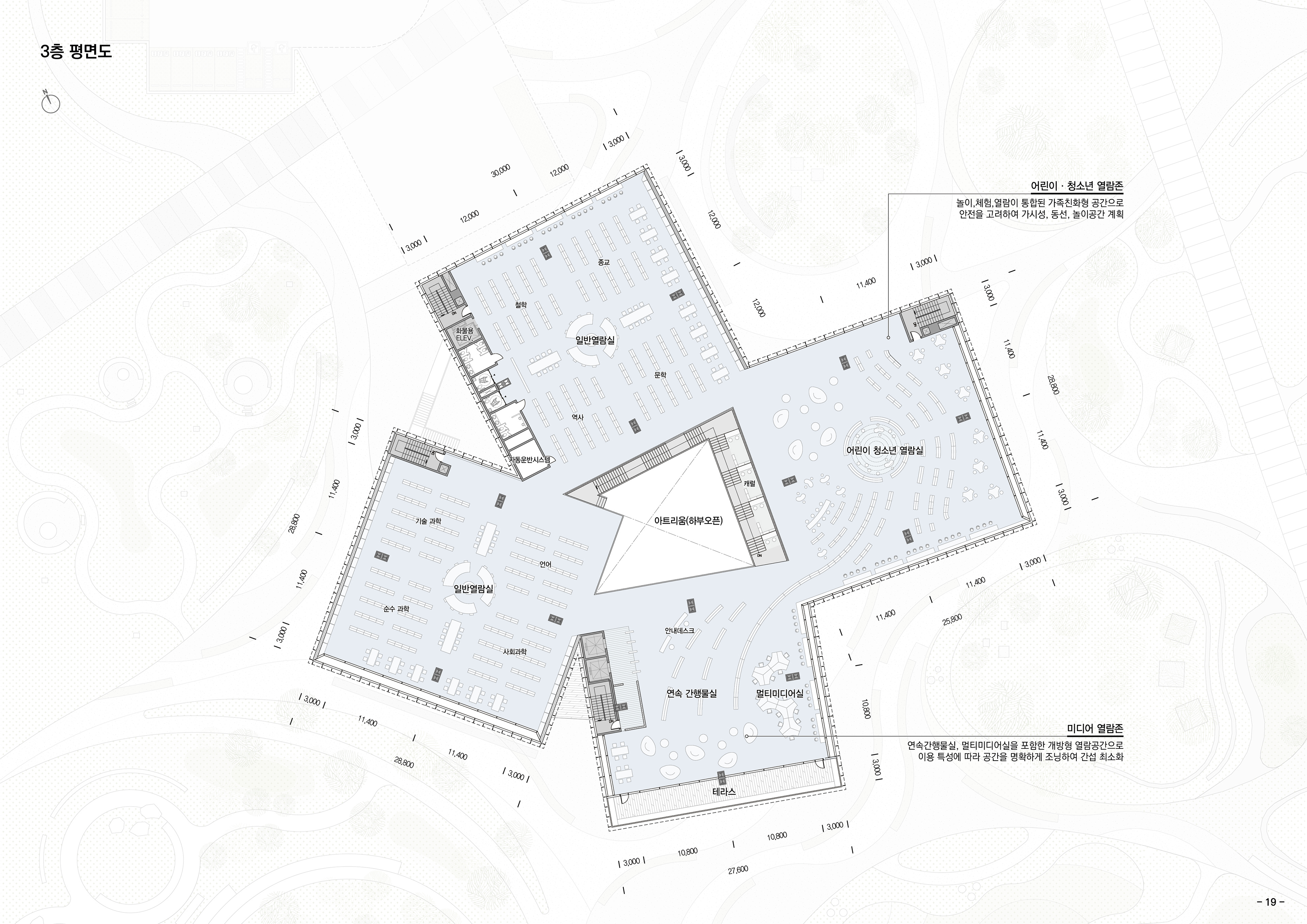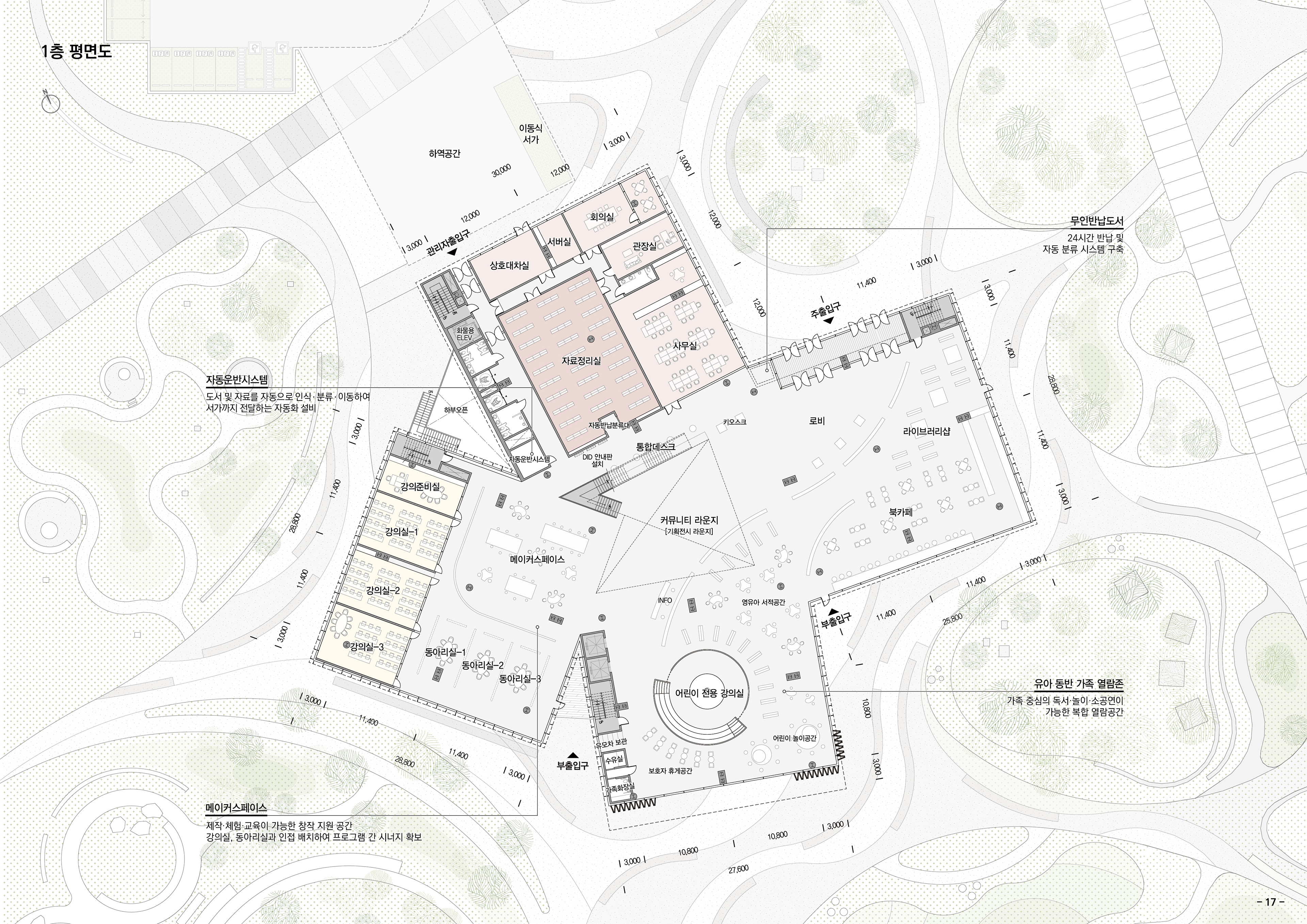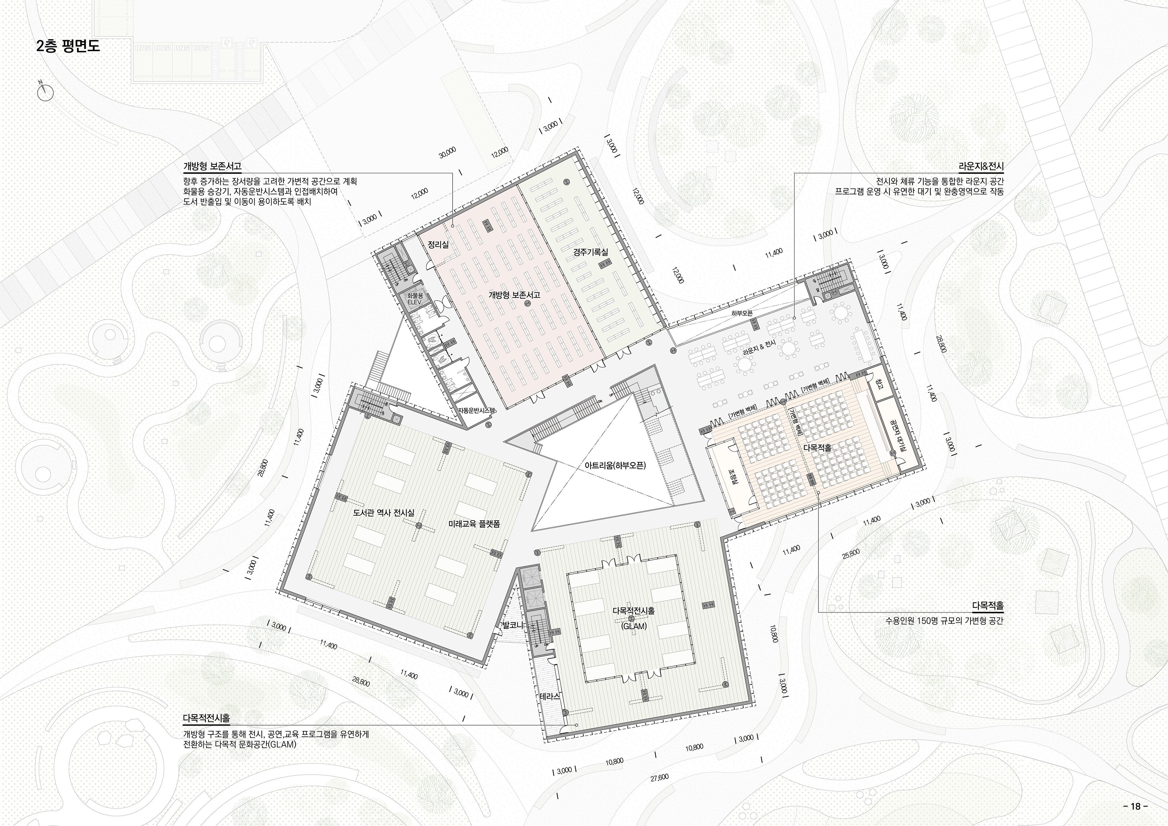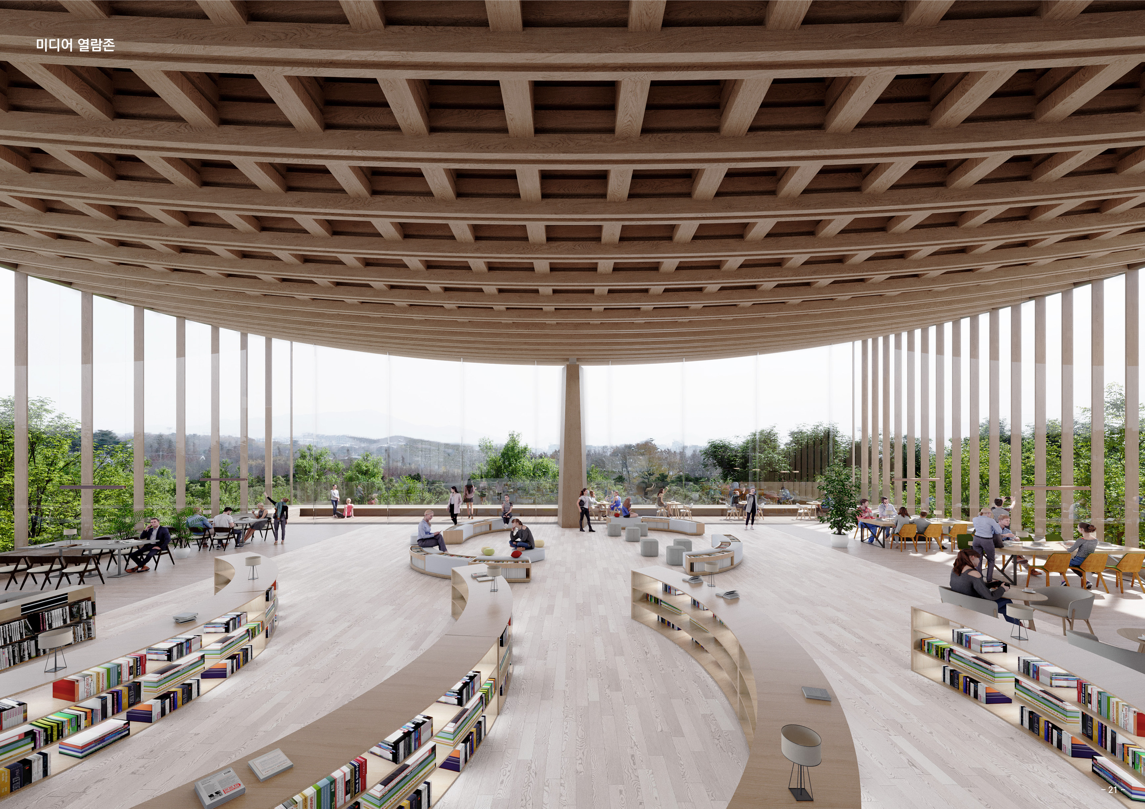 방문객의 많은 비율은 도서관 내의 오래 머물수 있는공간이 될것이다. 건축적 제안은 단순한 프로그램 나열이 아닌, 수직적으로 연계되는 하나의 시퀀스로 계획된다. 1층은 가장 활기있고 개방된 층으로, 사람들이 만나는 사회적 레벨. 2층은 빛과 환경을 조율하며 전시와 자료 관리가 안정적으로 이루어 지는 문화레벨, 3층은 숲에 둘러쌓인 독서와 사유에 깊이 몰입하는 관조의 레벨로 구성된다.
