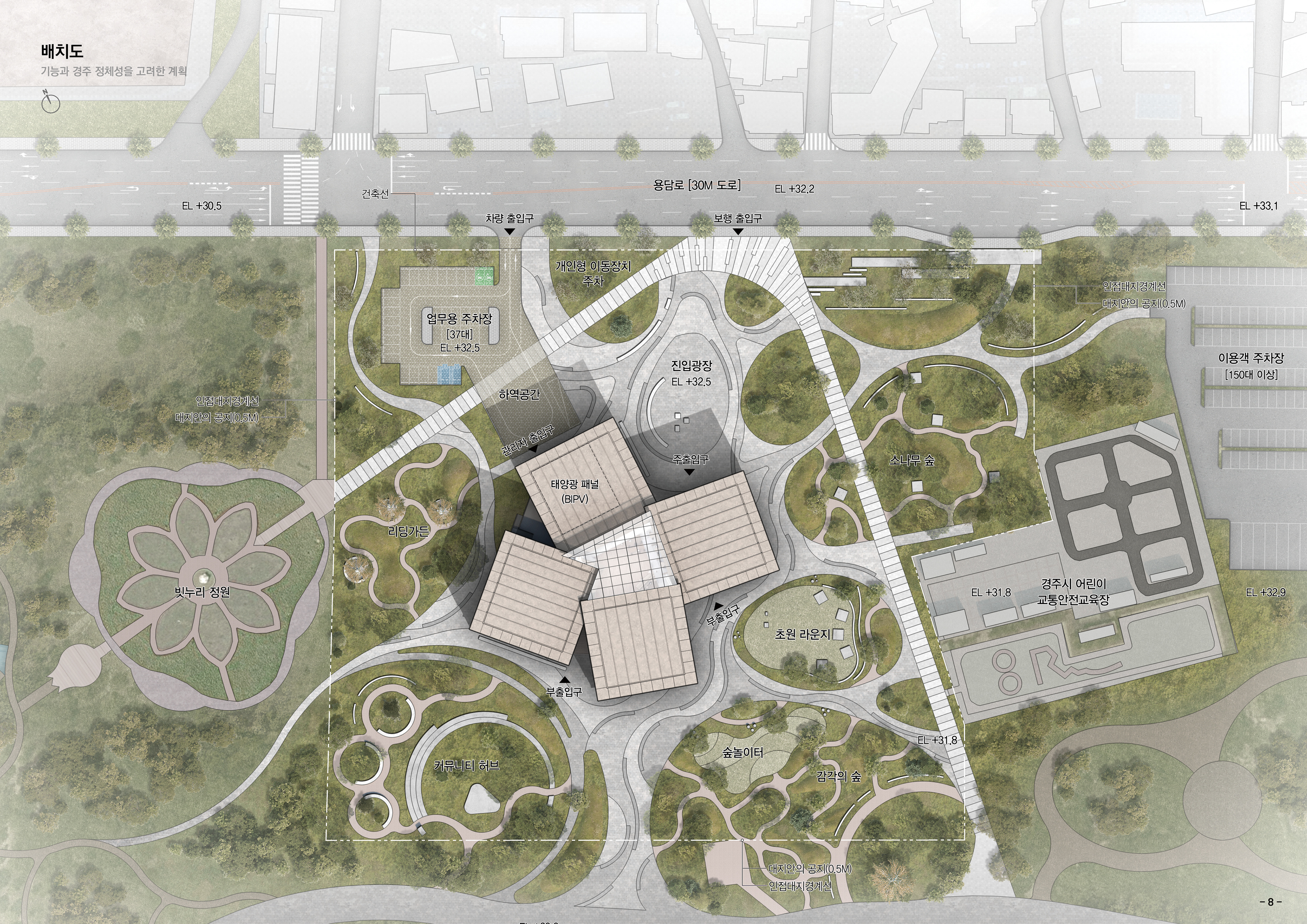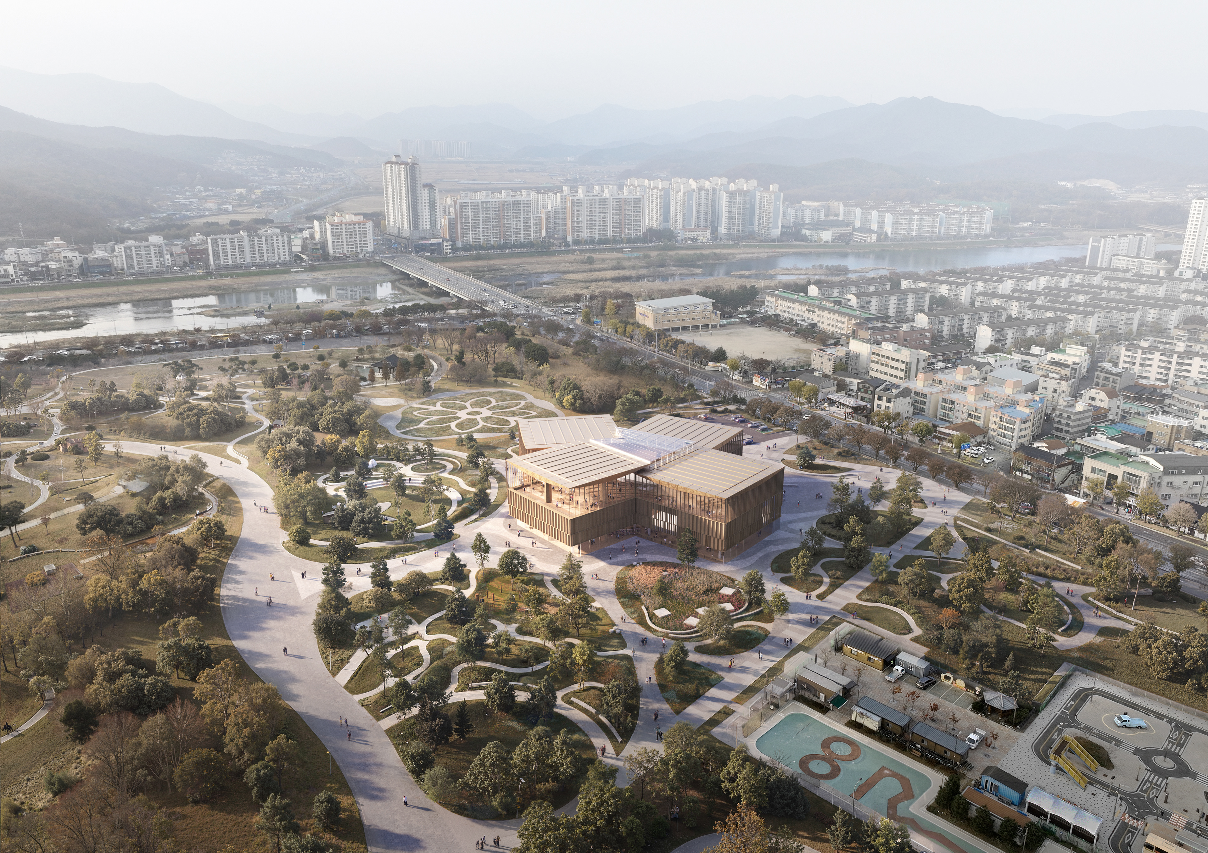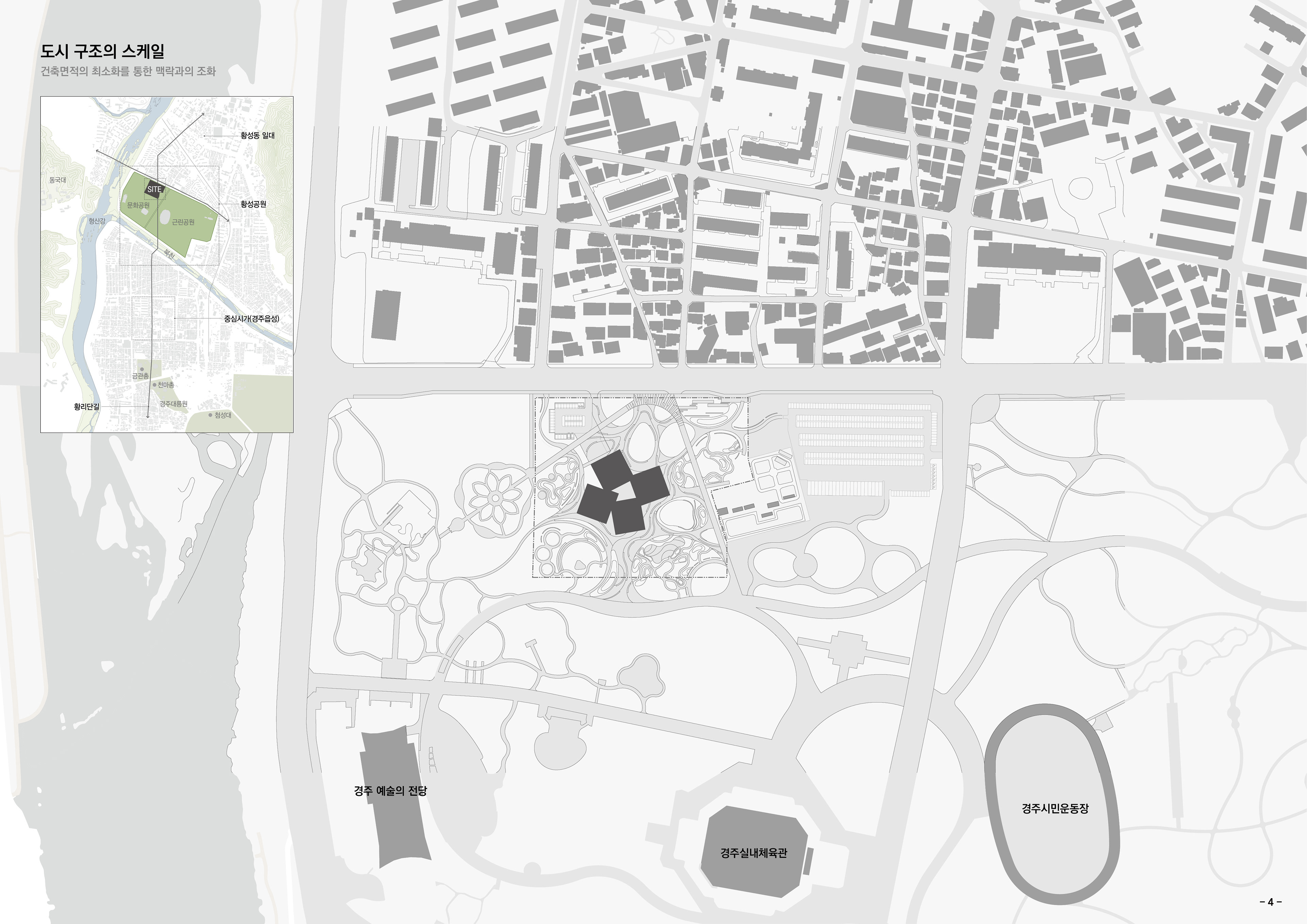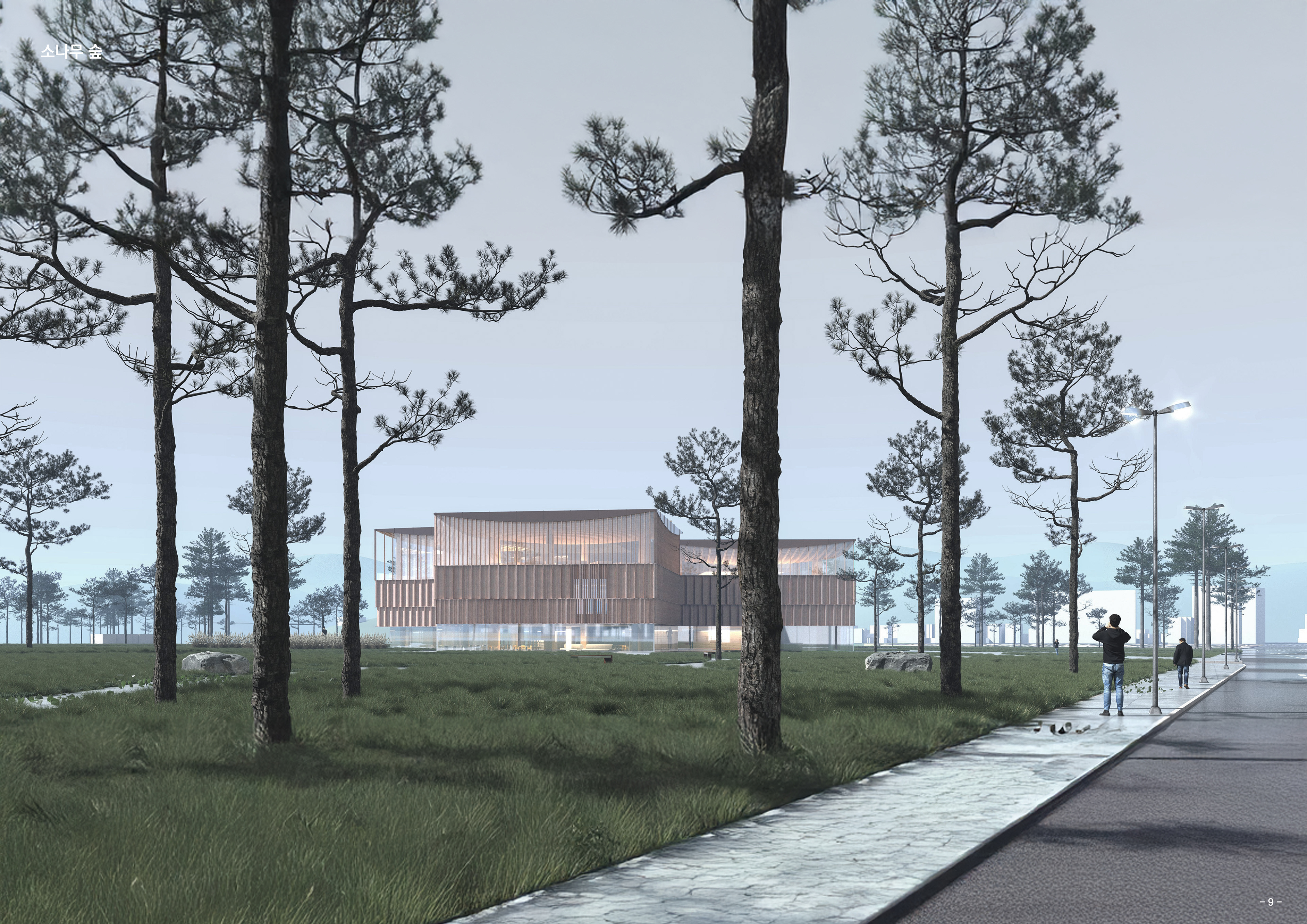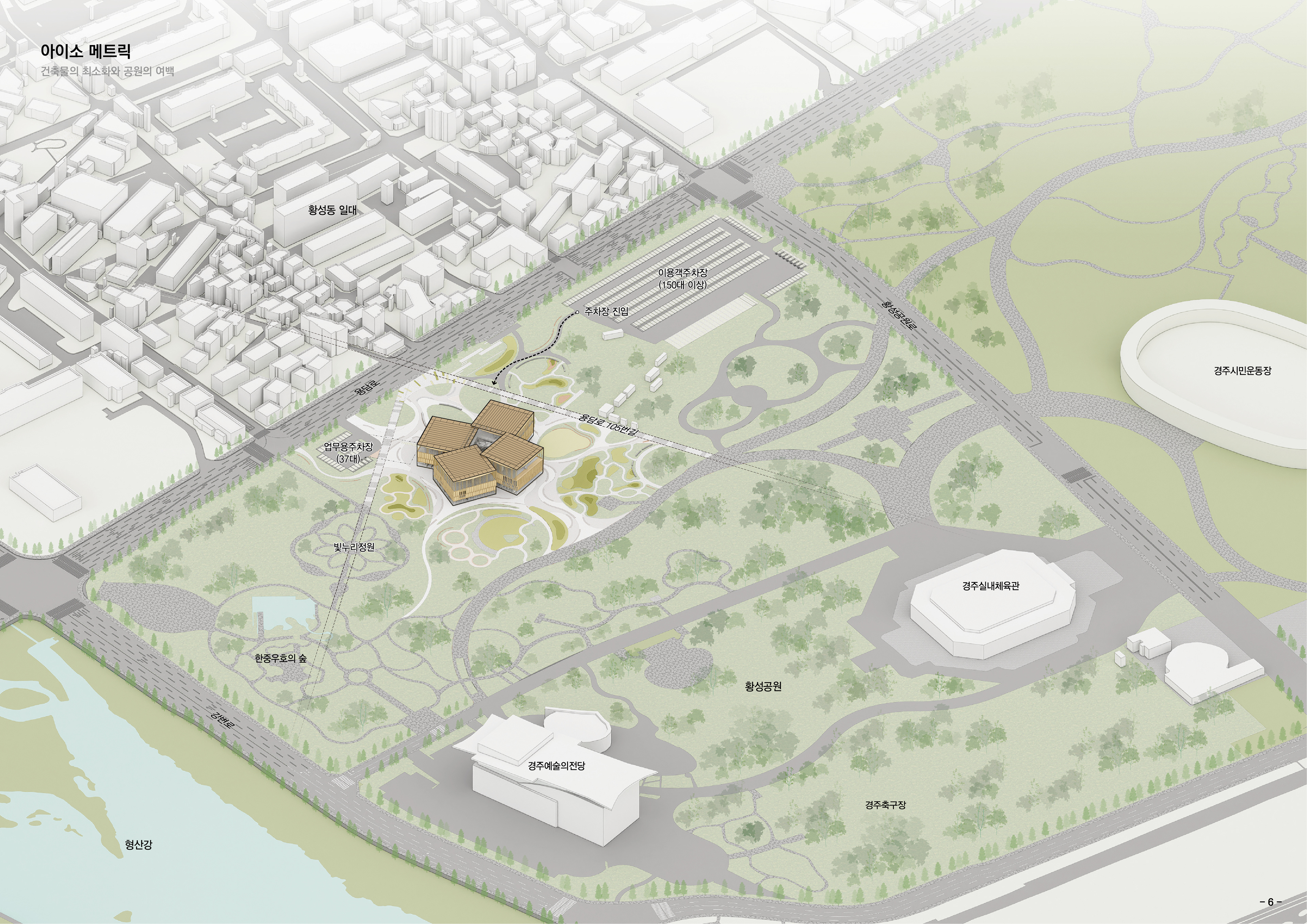 대지와 도시의 맥락에 맞는 메스와 옛길의 흐름에 따라 공원을 다시 연결하는 배치와 열림 - 집중 - 관조로 이어지는 수직적 연결을 통한 아트리움, 전통을 현대적으로 변주한 역쉘 목구조의 지붕을 통해 경주만의 정체성을 담아낸 건축을 제안하며, 공원속 고립된 형태적 오브제가 아닌, 고유성과 시간성을 재해석한다.