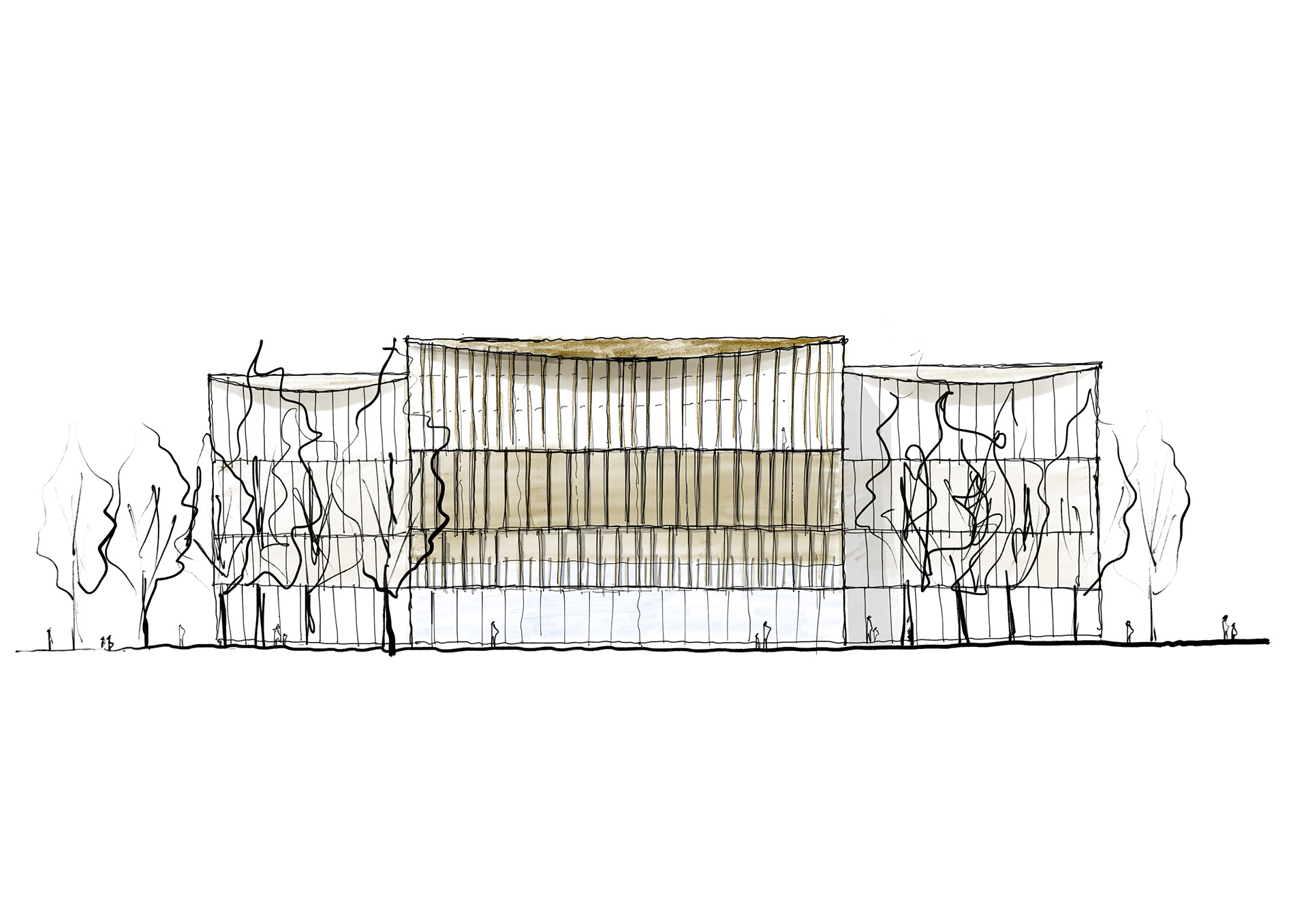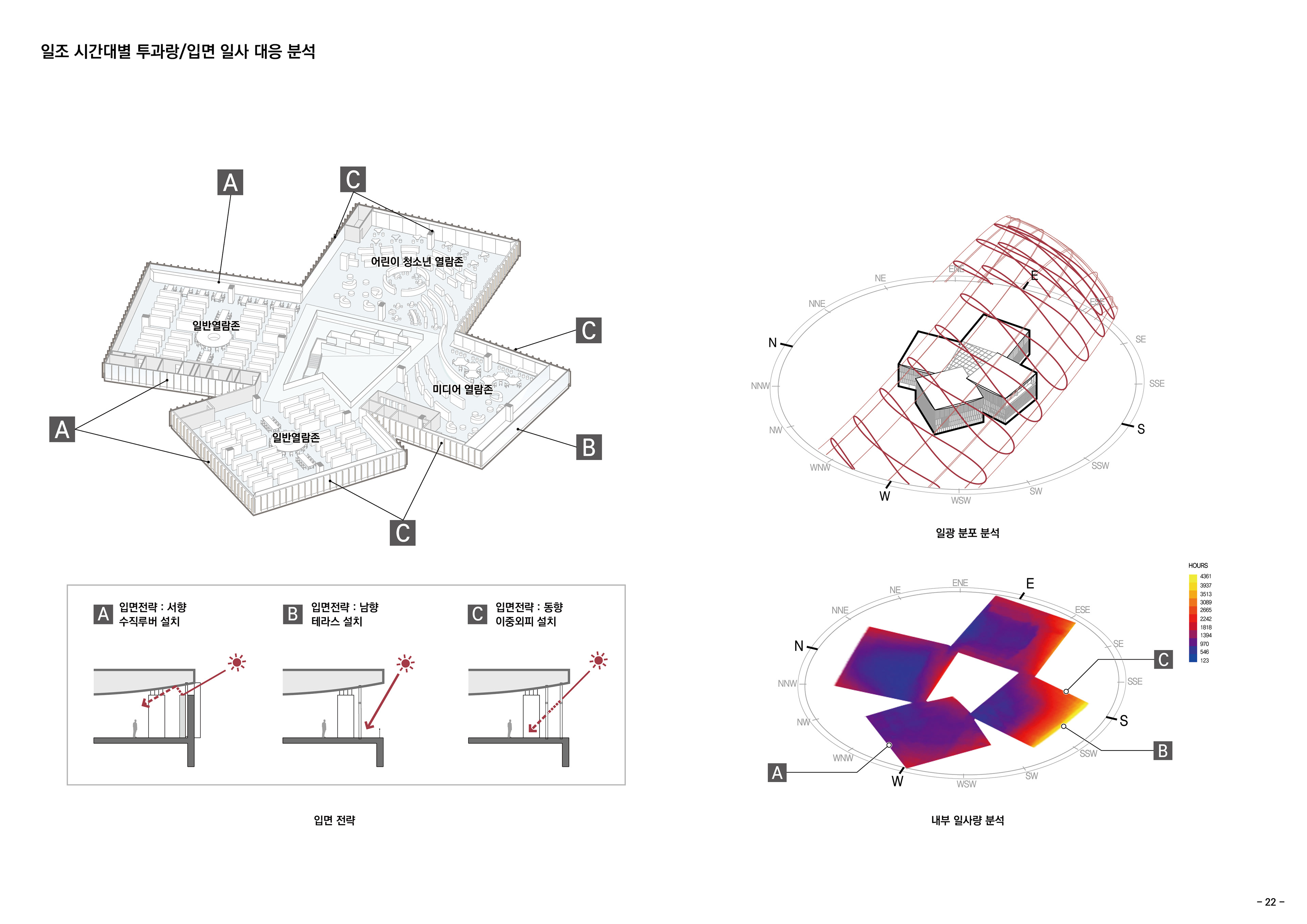열림과 개방성, 도서관의 특수한 환경에 최적화된 구성을 위해 일광분포, 시간대별 투과량에 대한 입변의 변화와 전략은, 내외부 공간의 환경을 제어한다. 이중외피 - 수직루버- 수평루버의 적용은 입면의 다양성과 함께, 내부의 독서 환경의 분위기를 조율한다.
