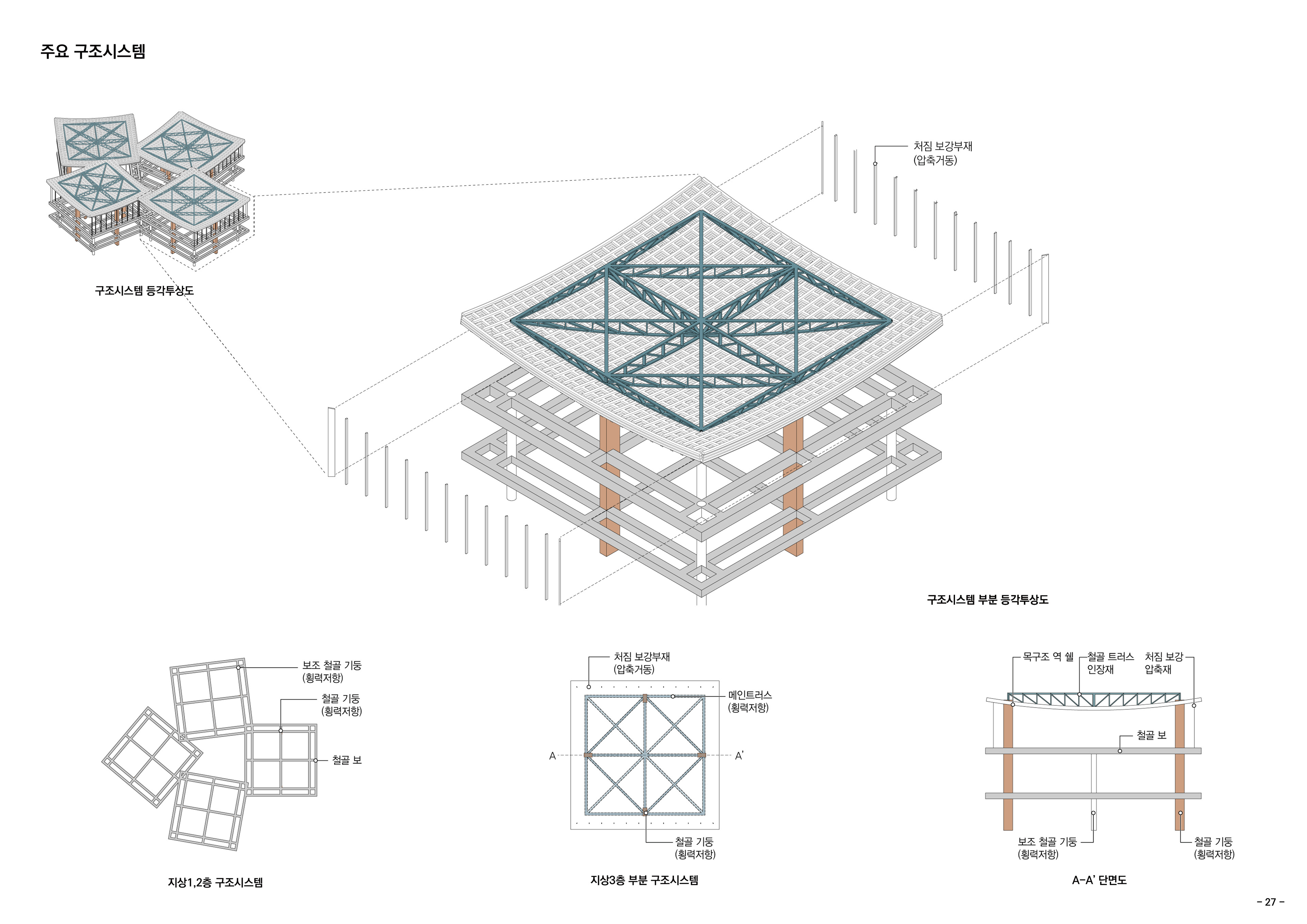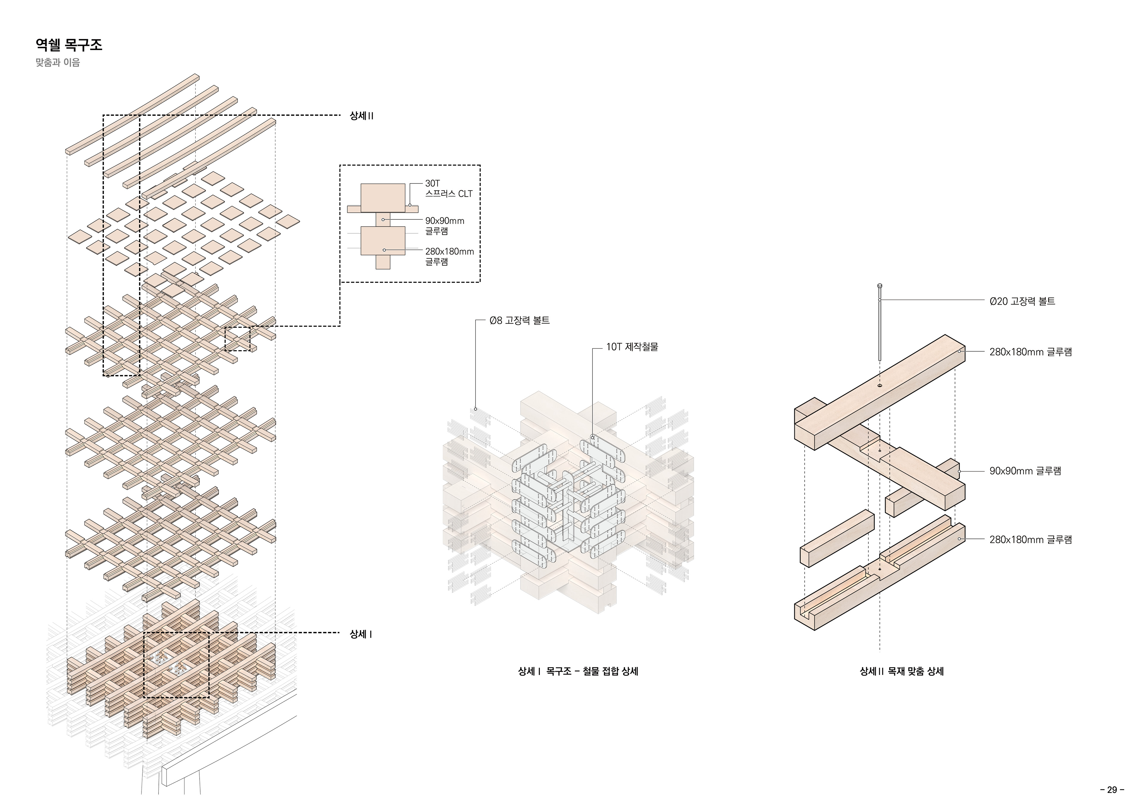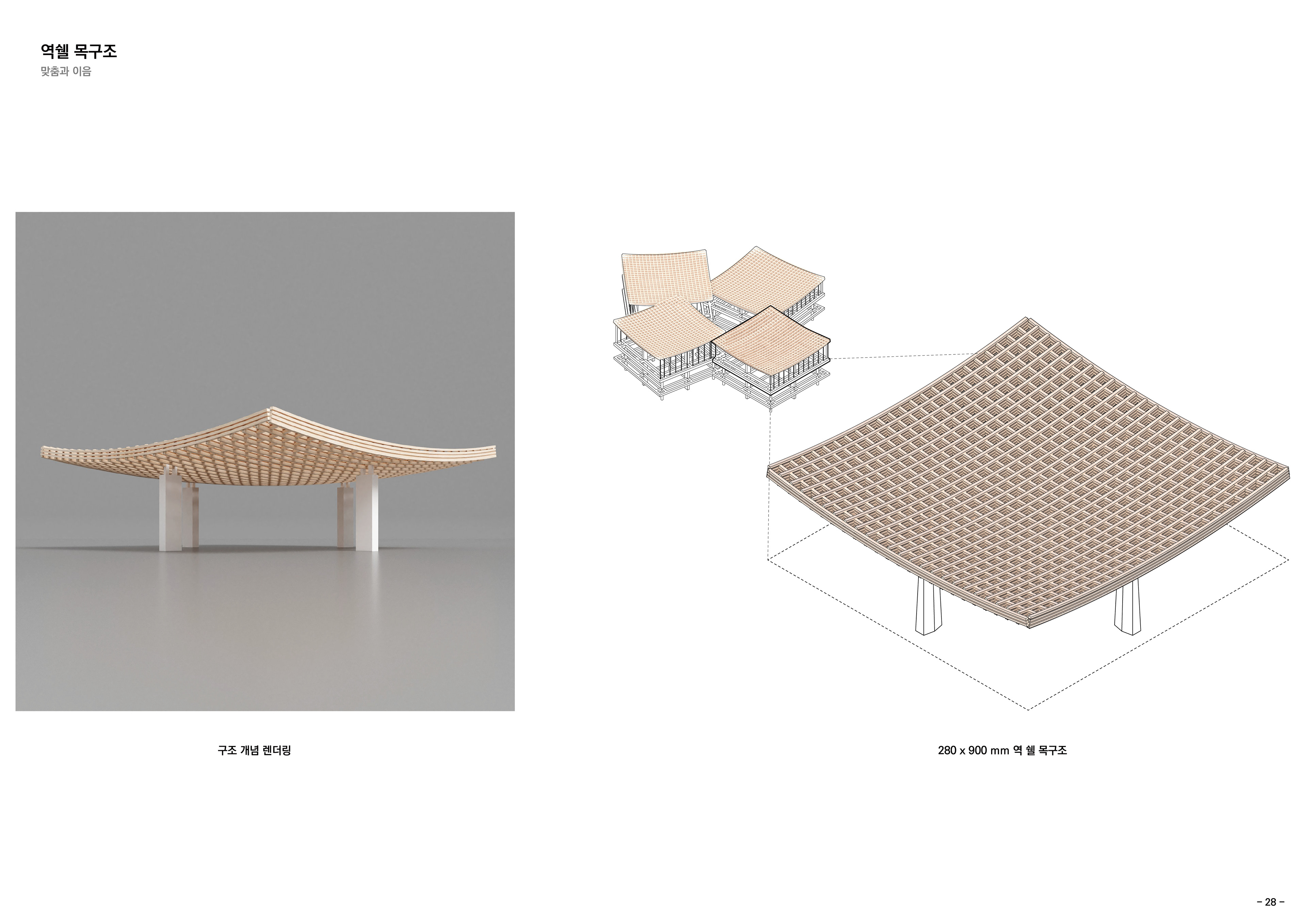 역쉘 [Reverse Shell] 형식의 목구조는, 기존 목조건축에서 전례를 찾기 어려운 시스템으로 구성된다. 전통 목조건축의 지붕 구조와 선을 현대적으로 재해석한 독창적인 사례가 될것이다. 7겹의 적층된 글루램 [Glulam] 부재는 동아시아 목구조의 공포와 지붕 맞춤-이음 방식의 계승으로, 이를 변형과 재해석을 통해 구현된다. 금속 철물과의 정밀한 결합을 통해 현대 건축에 요구되는 구조 성능과 맞닿은 새로운 하이브리드 목구조를 제안한다.